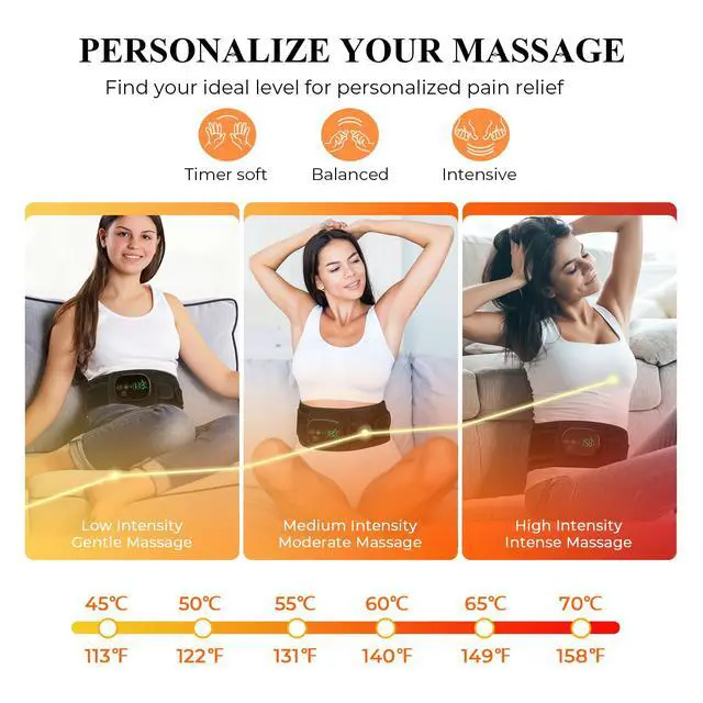 6 Heating Levels & 3 Vibration Modes Enjoy tailored relief with 6 adjustable heating levels (113°F-158°F) and 3 massage intensities - designed to deliver gradual warmth that won't irritate your skin. Unlike basic heating pads, our smart system lets you start low and increase slowly, preventing sudden overheating while maintaining steady comfort for stiff lower back muscles. Pair with soothing vibrations to relax tension, promote better blood flow along your spine, or ease discomfort after long hours of sitting.