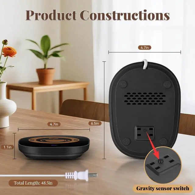 Automatic Sensing Switch: This coffee mug warmer has a gravity sensor switch. After plugging in power, put cup on will automatically keep warmer, and take cup away will automatically shut off.