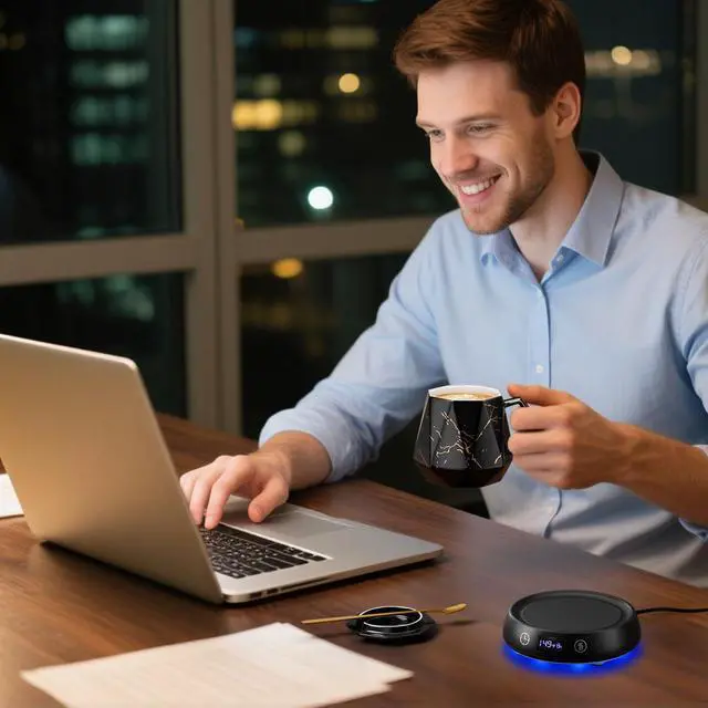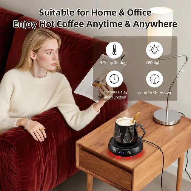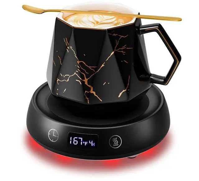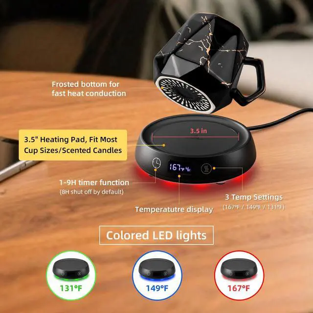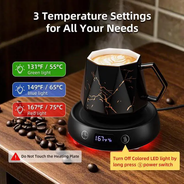 3-Mode LED Temperature Mug Warmer Set: Coffee cup warmer keeps beverages at ideal temps with precision control. One-touch switching between 131°F/149°F/167°F, Green/Blue/Red- perfect for keeping drinks at ideal temperature with coffee mug warmer. The warmer features bottom lighting with 3 colors LED light(can be turn off). This versatile coffee warmer & tea warmer works for lattes, cocoa, or baby bottles. You can enjoy your hot coffee any time