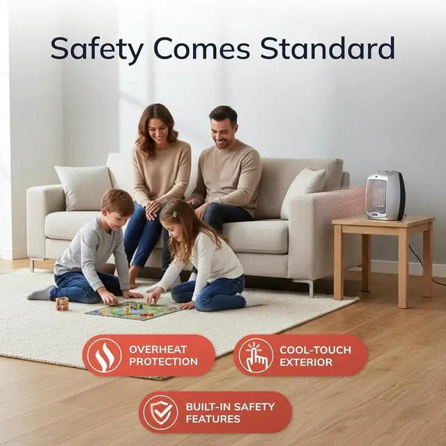 Built-in Safety Features - overheat protection ensures the space heater does not overheat even if left on for an extended amount of time. The space heater also features a cool-touch exterior. This allows the the space heater' s body to stay cool even when it' s on high.