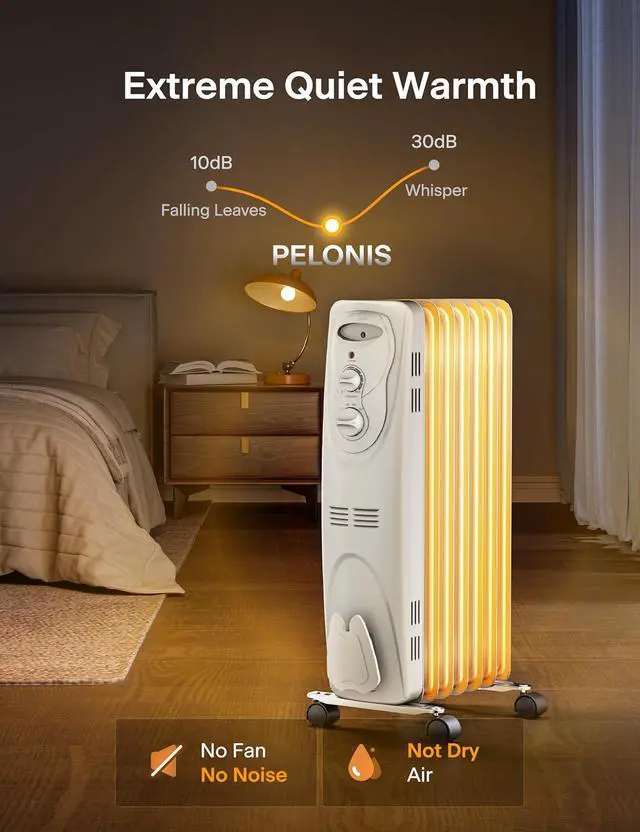 -: Lacking of fan construction, PELONIS oil heater is super quiet, perfect for bedrooms, offices, rooms and other indoor places where not fan of noise