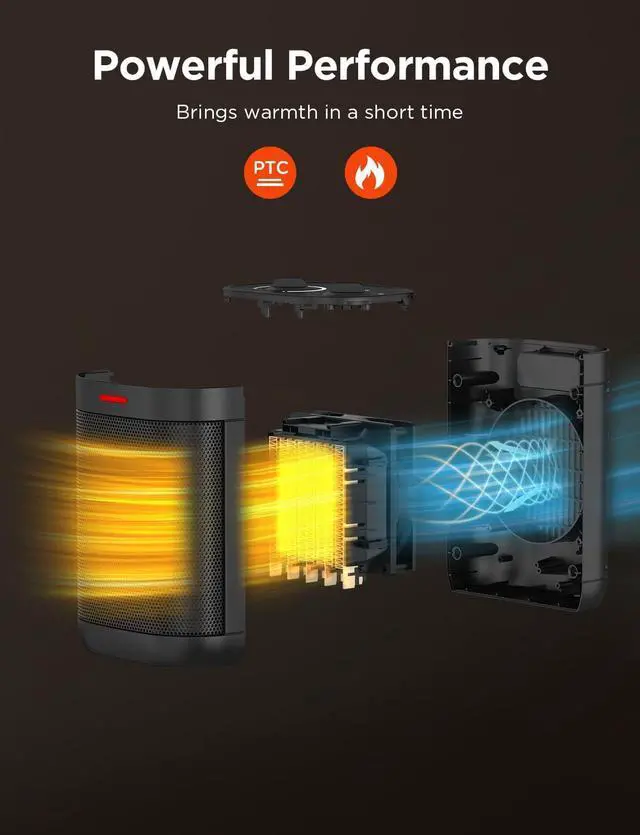 Suitable SizeThe small indoor heater measures 5.51 * 3.94 * 7.60 inch, which is perfect for bedrooms, offices and living rooms, not taking up too much space while still bringing you timely warmth. The body has a built-in carrying handle so you can easily lift it and place it anywhere you want to heat.