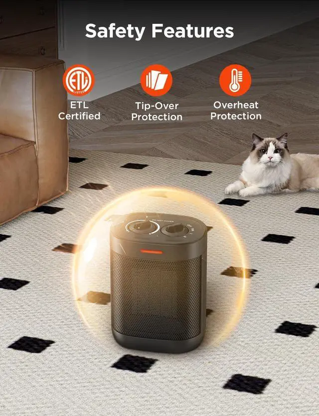 Built-in Safety FeaturesOur portable heater is made of high quality flame retardant material, which is ETL certified. Also the machine is equipped with a tip-over and Overheated safety protection, if the heater is bumped or the temperature is too high, it will automatically shut off, perfect for families with children and pets, creating a safe and comfortable environment for you.