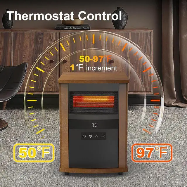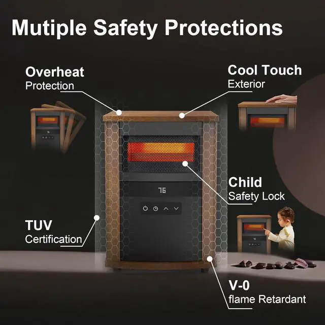 Infrared Heating: This portable electric heater features four infrared quartz elements that deliver efficient and even warmth, perfect for indoor use in any room.