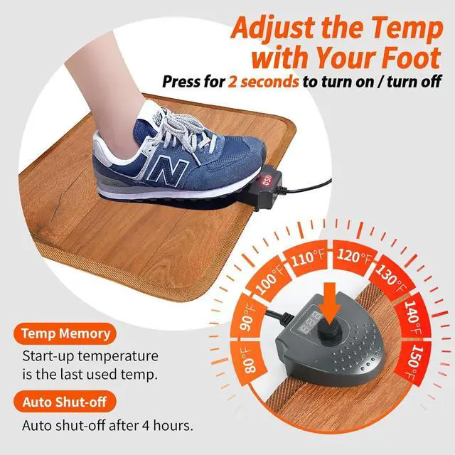 8-Level Adjustable Temp / Auto Shut OffThis foot space heater adopts foot switch temperature adjustment technology, temperature display, no need to bend over8 heating settings (you can choose 80-150), auto shuts off after three hours and a more user-friendly memory temperature function (It remembered what it was set at when turned off).