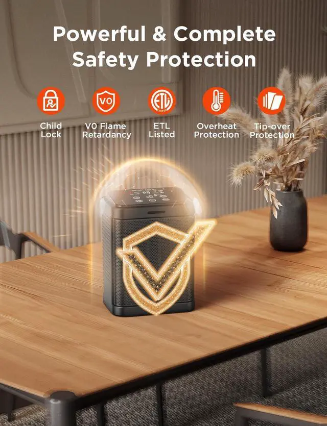 Safety First: The space heater is made of high quality flame retardant material. Overheat protection and dumping protection function can guarantee your safety during use, and the heater is also equipped with a child lock function to prevent children from accidentally touching the machine, so that you can use more at ease.