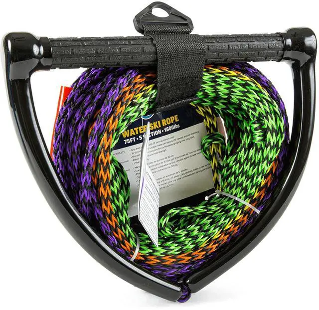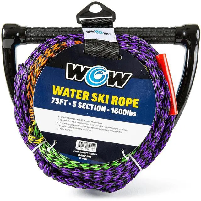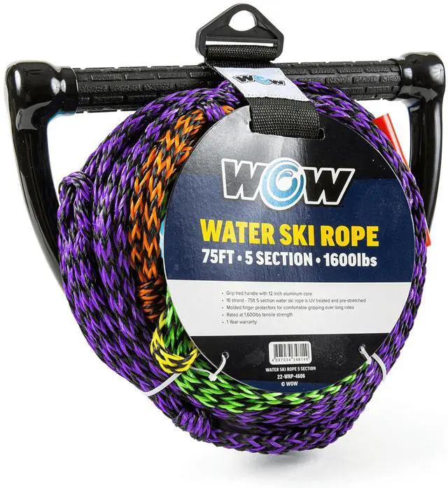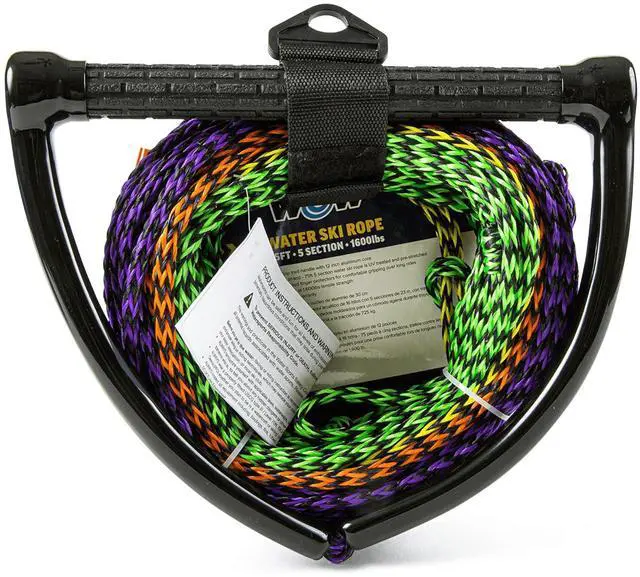 Built for serious water sports enthusiasts, this high-strength WOW Watersports water ski rope is rated up to 1, 600 lbs tensile strength, making it ideal for reliable towing behind any boat. It features a 12-inch aluminum core handle with a floating grip tread design that provides a secure, slip-resistant hold even in wet conditions. Molded finger protectors and end caps offer added comfort and support, allowing for extended use without hand fatigue - perfect for long sessions on the water. The rope itself is made from 16 durable strands and comes in a 5-section configuration, allowing you to adjust the length to suit your activity or skill level.