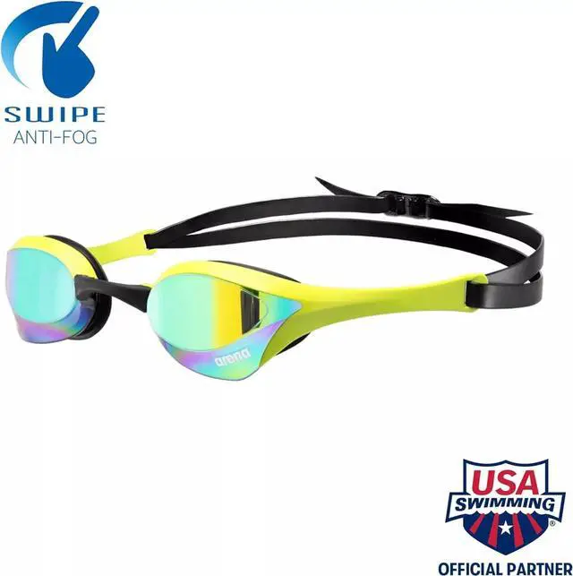 Discover the most advanced mirrored competitive racing goggles, the Cobra Ultra Swipe goggles, with arena's revolutionary Swipe Anti-Fog technology that lasts ten times longer and can be reactivated. Gently swipe the inner lenses five times with your fingertip while the goggles are in the water, making sure there is no dirt on the lenses while doing so. Do this every time the lenses become foggy to enjoy clear vision for longer.
