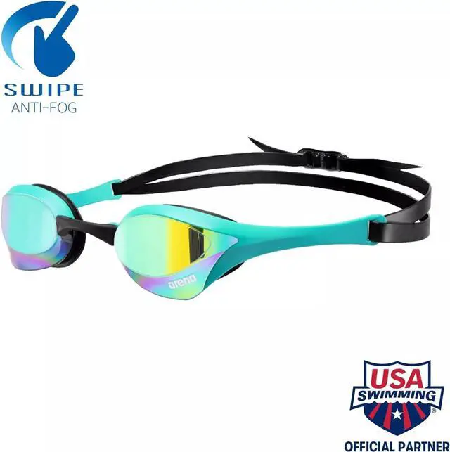 Discover the most advanced mirrored competitive racing goggles, the Cobra Ultra Swipe goggles, with arena's revolutionary Swipe Anti-Fog technology that lasts ten times longer and can be reactivated. Gently swipe the inner lenses five times with your fingertip while the goggles are in the water, making sure there is no dirt on the lenses while doing so. Do this every time the lenses become foggy to enjoy clear vision for longer.