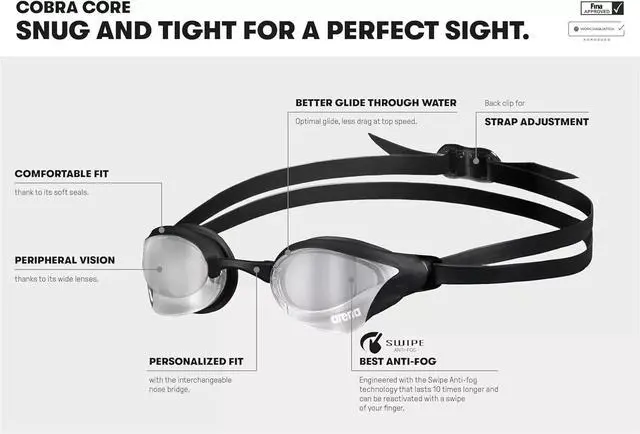 Its futuristic design is not the only thing to love about our new FINA-approved Cobra Core Swipe Mirror goggles. Their anti-fog technology lasts 10 times longer. When foggy, restore clear vision with a simple swipe. Created for competitive swimming, these goggles ensure wide vision, ultra comfort and less drag at top speed. With mirrored lenses and UV Protection they're ideal for indoor and outdoor swimming. Recommended for triathlons.