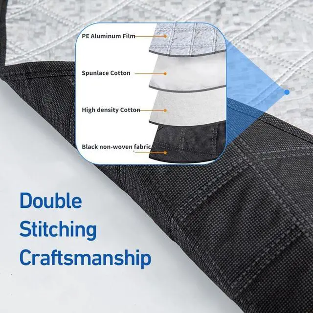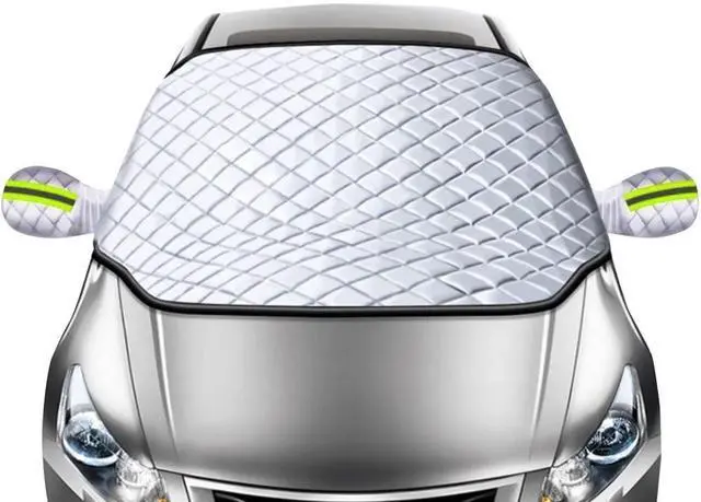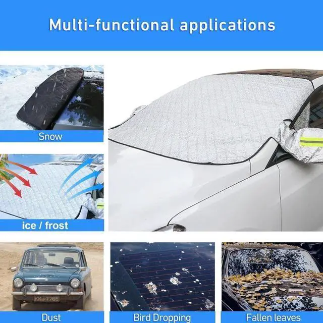- [Heavy Duty & Four Layers]The windshield winter cover is made of durable fabric with 4 layers ,(PEVA Aluminum Foil, Spunlaced Cotton, Composite Cotton, Soft Non-Woven Lining.)Thickened Car snow cover will be sturdy enough to protect your car windshield from damage in all seasons, help blocking the car wiper area from filling with leaves and pine needles.