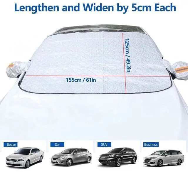 - Fits Most Sedan&SUV: with full mirror cover fit for sedan,SUV,etc.(If your SUV/truck is larger, you can choose from two other larger sizes)With windproof straps and thickened design, it can effectively lower the temperature inside the car in summer and effectively prevent rain and snow from freezing on the front window in winter.
