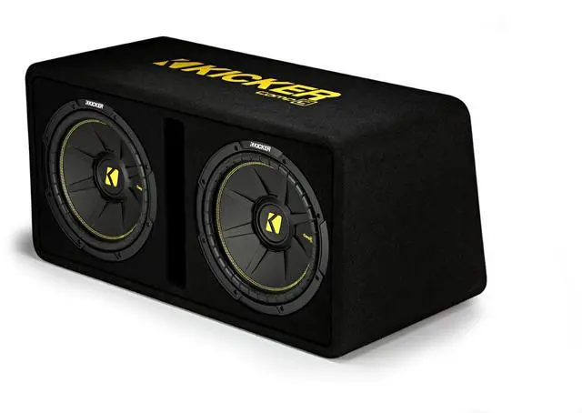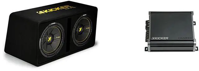 Enhance your car audio system with this powerful bundle, featuring the Kicker 46CXA8001T CXA8001 800-Watt Mono Class D Subwoofer Amp and the Kicker 44DCWC122 Dual CompC 12" Subwoofers in Vented Enclosure 2-Ohm. The Class-D CXA 800.1 amp pumps out up to 800 watts into one channel with a variable bass boost and 12dB crossovers for precise sound customization. It accepts high-level input signals without needing line-out converters and boasts FIT+ technology for seamless radio integration. The compact size and included vertical mounting hardware add installation flexibility. The Dual 12" CompC Subwoofers in the heavy MDF enclosure deliver deep bass, fitting perfectly in most vehicles with a custom port design and embroidered Kicker logo.