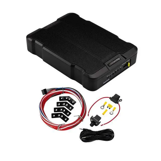 The Kicker 51HS12 Hideaway Compact Powered Subwoofer features a powered 12" subwoofer enclosure with 230W RMS, fits under the seat with a height of 3-1/2", FIT+ wide-range input from 0.25V 40V, remote bass control included, low-pass crossover, phase switch, and more. It delivers big bass impact in a compact design and comes with FIT+ wide-range inputs for modern vehicles.