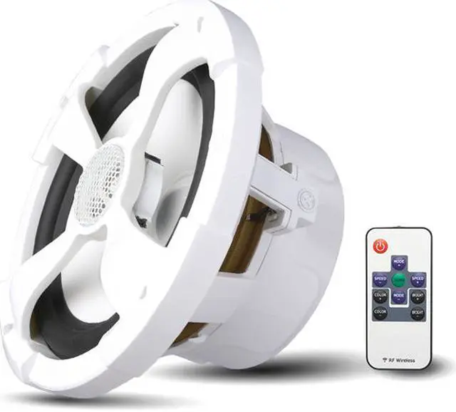 Features: Injection Molded UV-Treated White Polypropylene ConesTPO Thermoplastic Polyurethane SurroundUV-Resistant Hi-Impact White GrillsUV-Resistant White Polyamide Speaker BasketsUV-Resistant Grill Mounted Sealed Tweeters, MET (Marine Engineered Technology) Titanium Dome TweetersWater Proof Sealed Magnet CoversStainless Steel Hardware IncludedRGB illumination with Selectable Lighting EffectsRGB Remote Control IncludedLink up to 12 speakers (6 pair) to one Remote Control