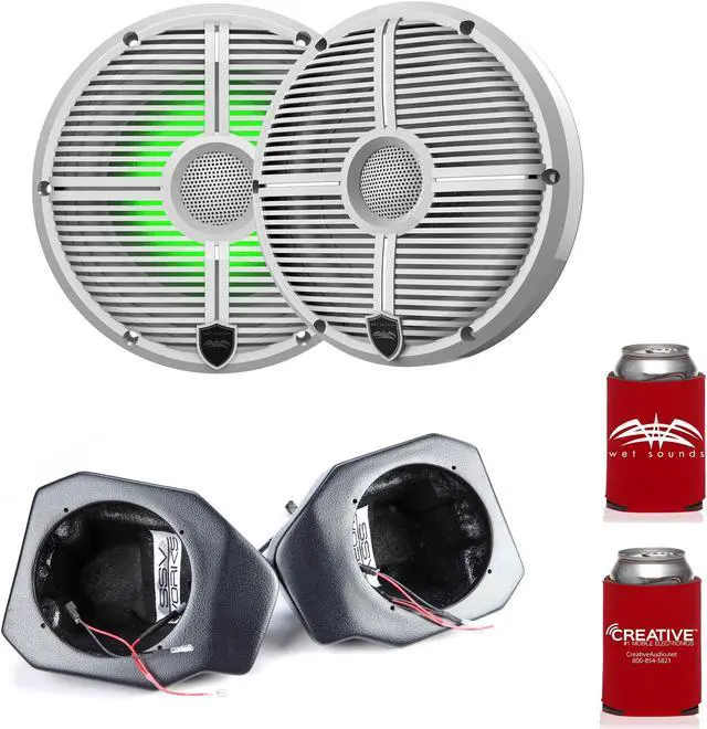 Wet Sounds Recon6-XWW-RGB 6.5" White Grill RGB Marine Speakers with SSV RG4-F65U Ranger XP1000 2018 and up Front Speaker Pods - This bundle is for a 2018 and up Polaris Ranger XP1000. It includes a pair of Wet Sounds RECON 6 XW-W RGB LED Recon Series 6.5" 60-Watt RMS Coaxial Speakers With White XW Grilles, a pair of SSV Works RG4-F65u 6.5" Front Kick Pods For Polaris Ranger XP1000, and a Wet Sounds coozy.