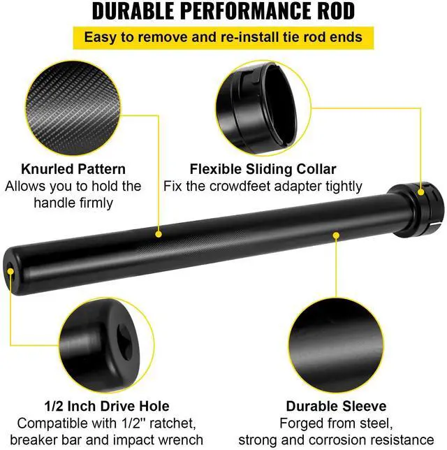 Ultra Durable Rod: Our tie rod drawing tools and adapters are all-steel forged and can be used for a long time. The flexible sliding collar on the sleeve's top can tightly fix the crowd feet adapters. It is compatible with 1/2" drive wrenches and helps you get the parts that ordinary wrenches cannot install; its knurled handle allows you to firm control at any time.