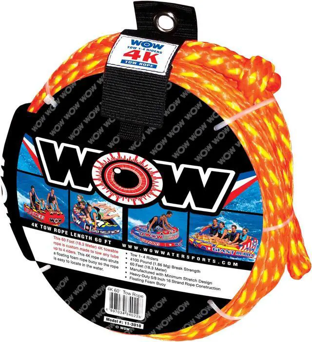 WOW WATERSPORTS 4K 60' TOW ROPE4K- 60' Tow RopeThis 4K towable rope is custom made to tow any tube up to 4 riders. This 4K rope also struts a floating foam rope buoy so rope is easy to locate in the water.