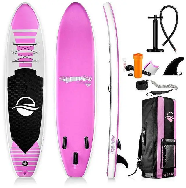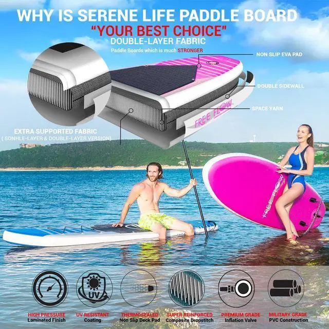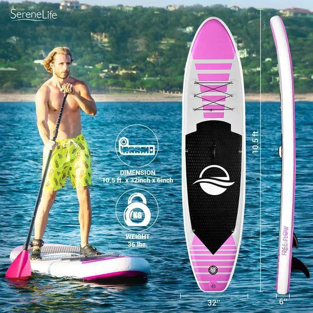 The SereneLife 10.5 ' Free-Flow Inflatable Stand-Up Paddle Board (SUP) (SLSUPB145) is the ultimate choice for those seeking a reliable, durable, and easy-to-use paddle board. Designed for single riders, this board provides exceptional stability and balance, making it perfect for beginners and experienced paddlers alike.