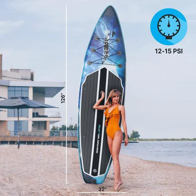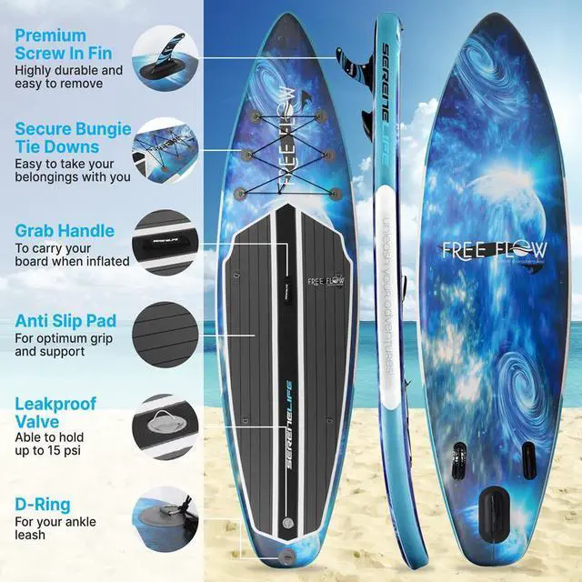The SereneLife 10.5 ' Rising Flow Inflatable Stand-Up Paddle Board (SLSUPB872) is built for adventurers looking for both performance and durability. This paddleboard is designed for single riders and offers exceptional stability with its extra-wide deck and three bottom fins that ensure enhanced steering and speed.