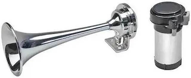 Marine Air Horn, Electric, Length (In. ) 9-1/2, Width (In. ) 3-1/2, Height (In. ) 3-3/4, Material Brass, Finish Chrome Plated, Bracket Mount Mounting, Decibels (dB) 126, Pressure (PSI) 10 to 12, 11 Amps, Voltage 24VDC, For Use On Boat and Marine Application, Includes Compressor, Hose, 30A Relay, Mounting Hardware. This item has been restricted from sale in the following state (s): []