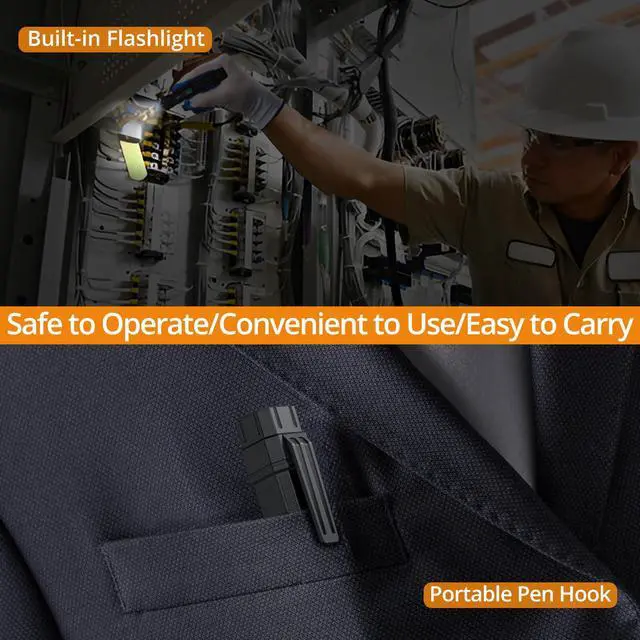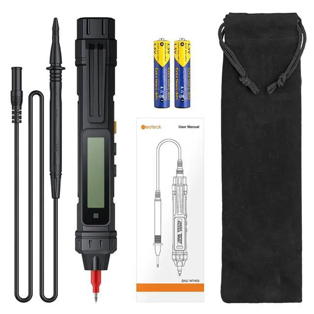 Includes: 2 test leads (remove protective caps before use), built-in flashlight for dark spaces, pen clip for pocket access, velvet storage pouch, and 2x AAA batteries. Auto power-off conserves energy – engineered for clutter-free mobility in fieldwork, labs, and home repair