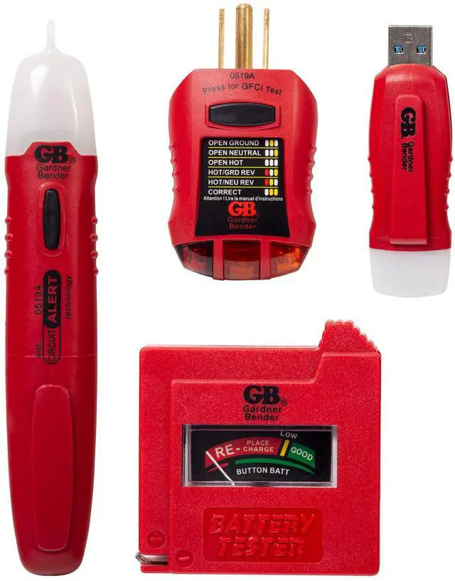 This indispensable household tester kit includes the most commonly used testers to test Voltage, GFCI receptacles, batteries, and USB ports. The voltage tester allows the user to verify the presence of AC voltage prior to working on an electrical installation or during troubleshooting without requiring physical contact with live electrical conductors. The included GFCI receptacle tester detects common wiring problems in standard and GFCI protected outlets. Simply plug it in and view the light pattern on the tester to determine if it's correct, open ground, open neutral, open hot, hot/grd reverse, or hot/neu reverse. Tester works on 110-125 VAC receptacles only and will not indicate quality of ground. The battery tester tests common household battery types (AA, AAA, C, D, and 9V batteries) to determine existing charge. Finally, the USB tester can check USB ports for the presence of voltage and test for proper wiring and polarity. Simply plug it into a USB port and the indicator bulb will glow a certain color to tell you the condition of the USB port.