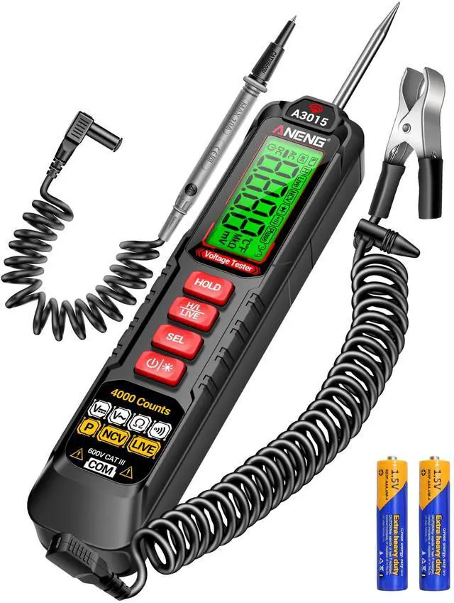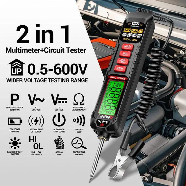 The A3015 is a circuit tester and multimeter with AC phase sequence detection that can measure AC/DC voltages from 4V to 600V.It includes pointed probes,test leads,and alligator clips for NCV,continuity,resistance,and data retention,making it ideal for testing and repairing electrical equipment