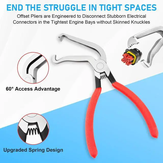 DUAL-ANGLE DESIGN FOR TIGHT SPACES: This electrical disconnect pliers set features both straight and 60-degree angled heads. It is used for safely unlocking push-tab connectors in cramped engine areas, such as at fuel injectors or ignition coils, addressing the challenge of hard-to-reach components