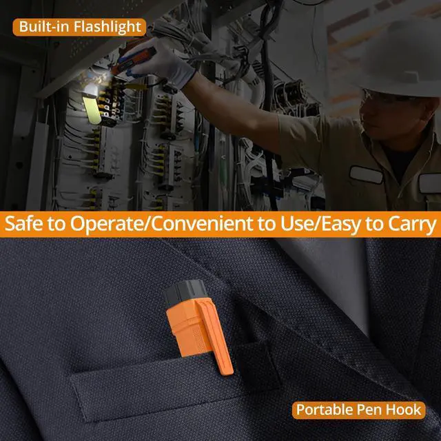 Includes: 2 test leads (remove protective caps before use), built-in flashlight for dark spaces, pen clip for pocket access, velvet storage pouch, and 2x AAA batteries. Auto power-off conserves energy – engineered for clutter-free mobility in fieldwork, labs, and home repair