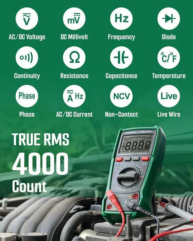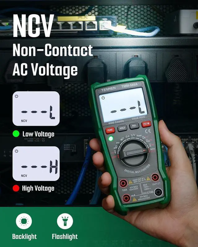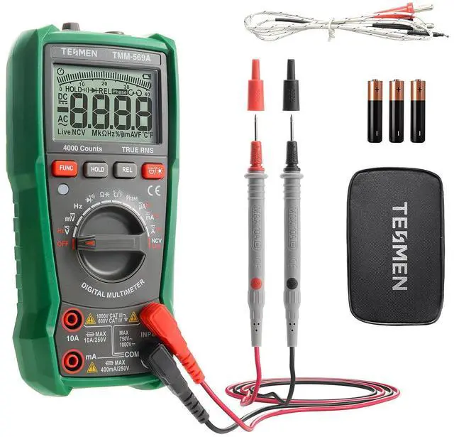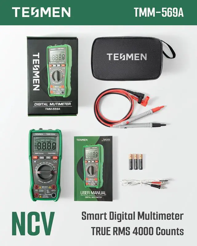 The TMM-569A Smart Digital Multimeter is a versatile and reliable tool designed to meet all your measurement needs with ease and safety. Featuring automatic range selection with TRUE RMS 4000 counts, it allows for accurate measurements of NCV, DC/AC Voltage & Current, Phase, Resistance, Continuity, Diode, Capacitance, Temperature, and Live Wire. The REL measurement function ensures precise relative measurements for various scenarios.