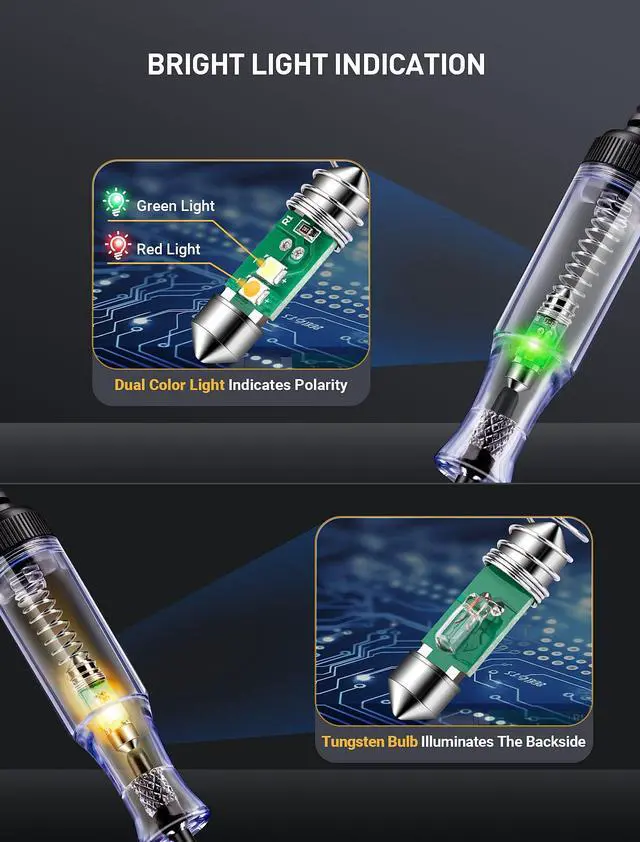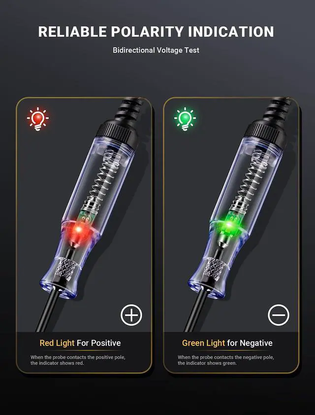 DUAL COLOR INDICATION LIGHTAdding dual color light for circuit's signal, red light indicates positive polarity & green light indicates negative polarity. Quality bulbs built in this light tester, where provides a bright and reliable light indication, guiding you through intricate electrical tasks to the source of the problem with ease.