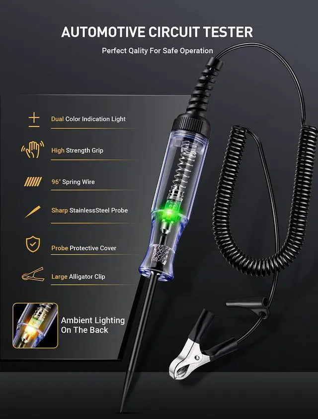 Wide ApplicationDIY automotive circuit tester/circuit test light with 6-24V DC voltage testing range, ideal for checking various vehicles electrical circuits, quickly check automotive headlights, taillights, turn signal circuits, faulty sockets, fuse connections, also for testing other 6-24v DC wirings and circuits.