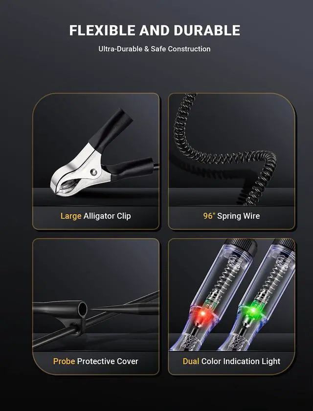 PREMIUM SPRING WIRE & ERGONOMIC DESIGNMaximum extended to 96 inch long enough spring wire increases flexibility and a wide measuring area when testing, anti-bending design of the tail wire makes no worry about bad contact of the line. Along with large size crocodile clip for easy one-hand operation, will definitely improve your working efficiency.