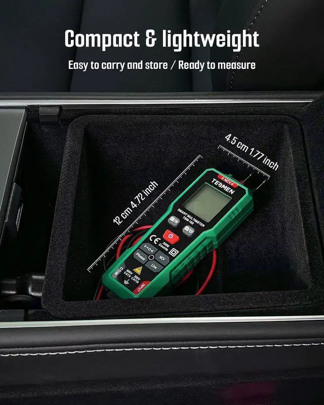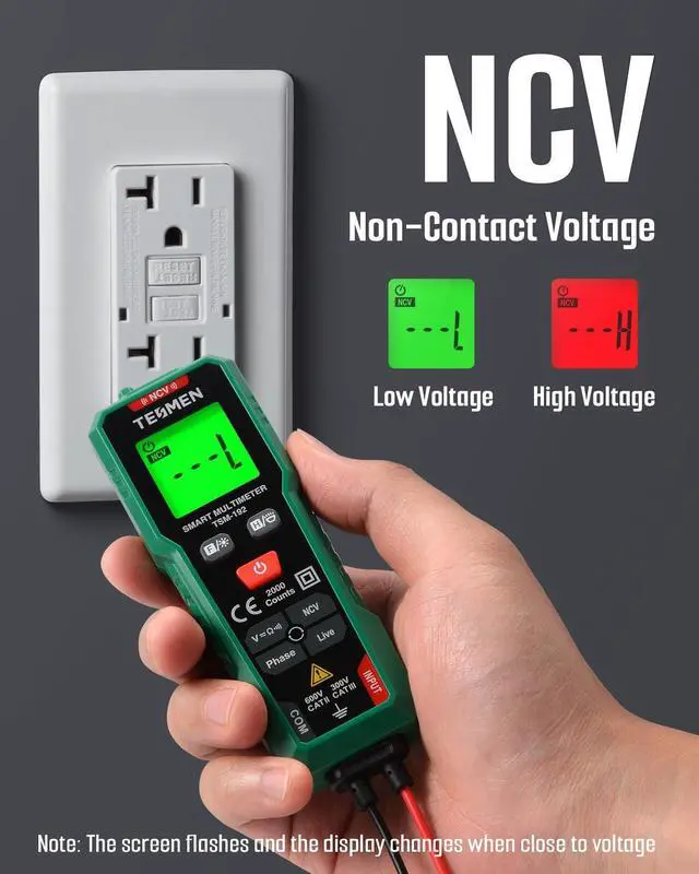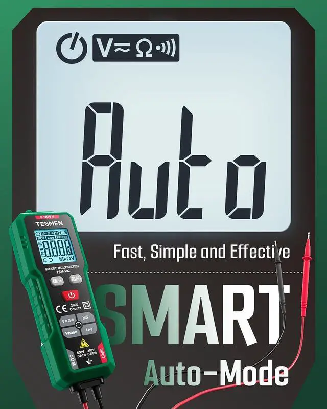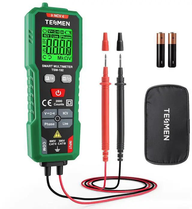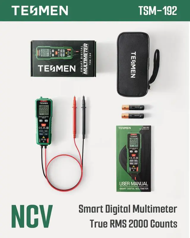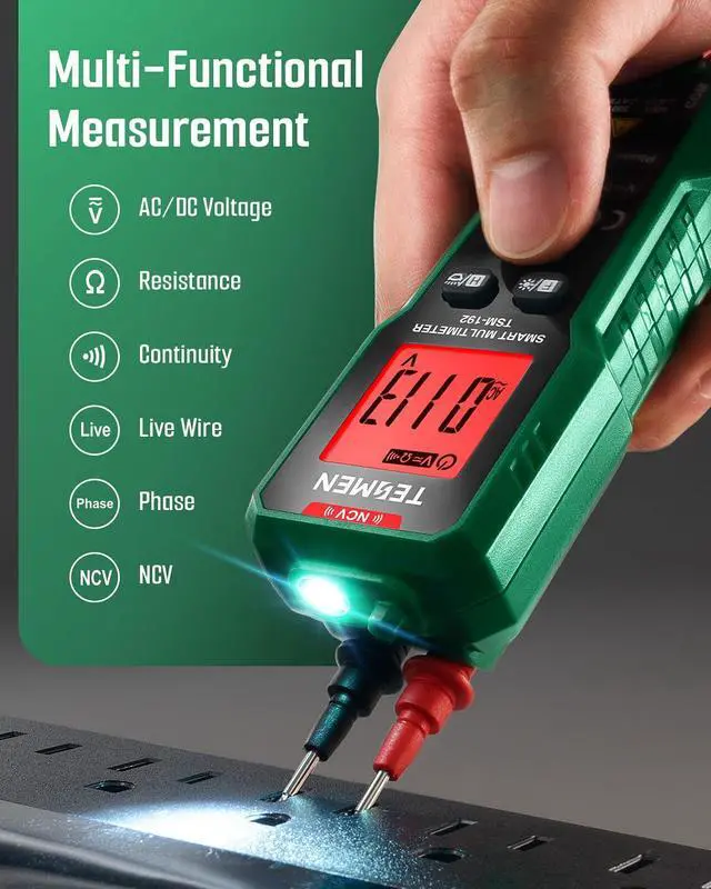 TSM-192 is a handheld smart digital multimeter, it can accurately measure phase, AC/DC voltage, resistance, continuity, non-contact voltage and live wire, it can safely and accurately test all kinds of household electrics and troubleshooting problems in automotive electronics, it is widely applicable to meet your different measurement needs. The casing is made of durable and tough materials for long-term use without problems. In addition, it can also be measured while holding the multimeter in your hand, measuring while watching, easy measurement for one person. Come and feel this smart multimeter which is compact in size and easy to carry!