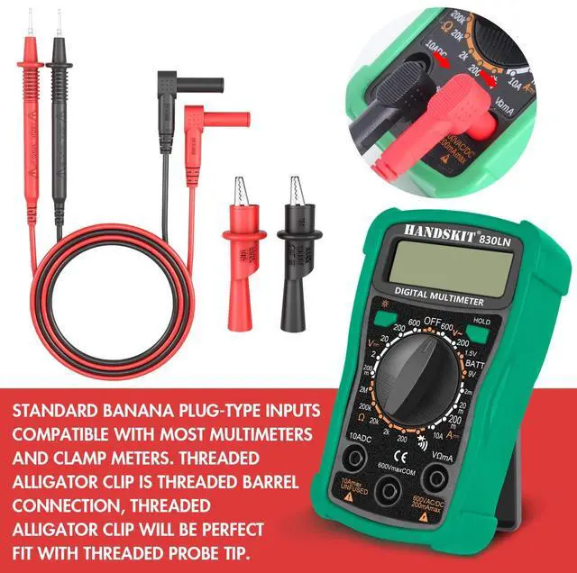 - Standard banana plug-type inputs compatible with most multimeters and clamp meters, removable alligator clips attach to wires and other conductors.