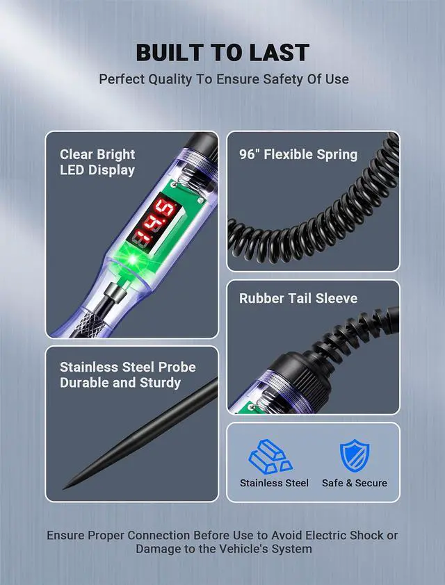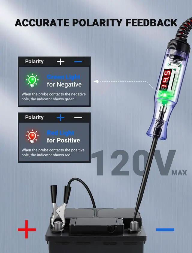 ACCURATE LED DIGITAL READOUTS: This automotive test light allows you to quickly and accurately check electrical circuits. Its high-visibility LED digital display shows clear readings under any lighting conditions. This ensures reliable readings, whether for testing car lights, batteries, or other automotive circuits.