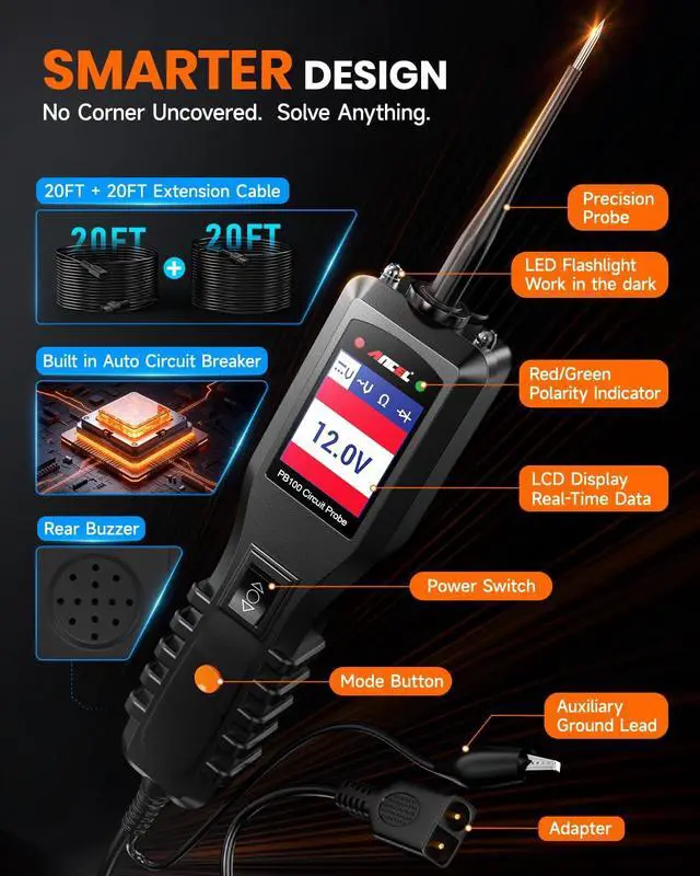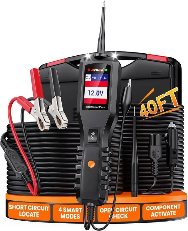 All-in-One Power Circuit Tester for 630V SystemsThe ANCEL Electrical Tester provides a complete solution for diagnosing vehicle electrical systems, supporting Voltage & Polarity Checks, Continuity Testing, Signal Circuit Verification, Component Activation, Bad-Ground Detection, and Short-Circuit Locating with Built-in Circuit Breaker Protection. Its clear display, intuitive interface, and extended cable setup20ft integrated lead plus an extra 20ft extension and a cigarette-lighter adapterallow you to work comfortably around the entire vehicle. Designed for both beginners and experienced technicians, it delivers accurate, efficient electrical troubleshooting in one versatile tool.
