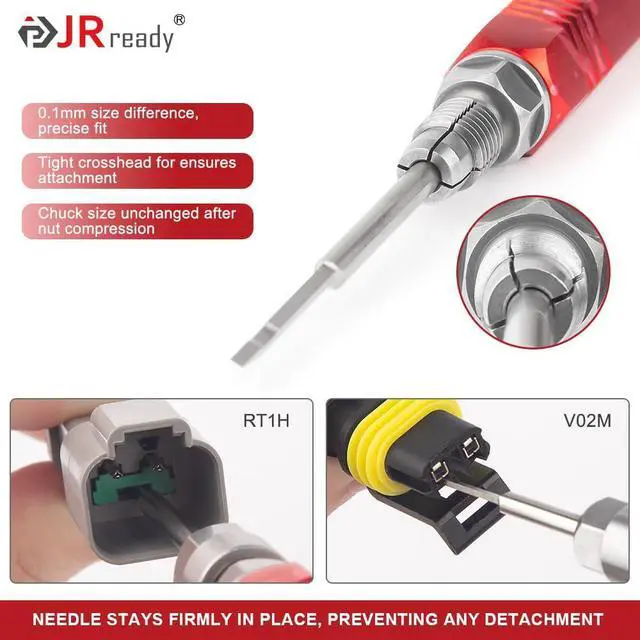 Interchangeable Needle HeadsElectrical Pin removal Tool come with a unique feature of detachable and interchangeable needle heads, Designed for various connectors including AMP SUPERSEAL 1.5 series and MULTILOCK .070 series connectors; JST; GT150; GT280; Metri Pack 150 and Metri Pack 280; TE; Deutsch series connectors. Versatile Needle Heads for All Your !