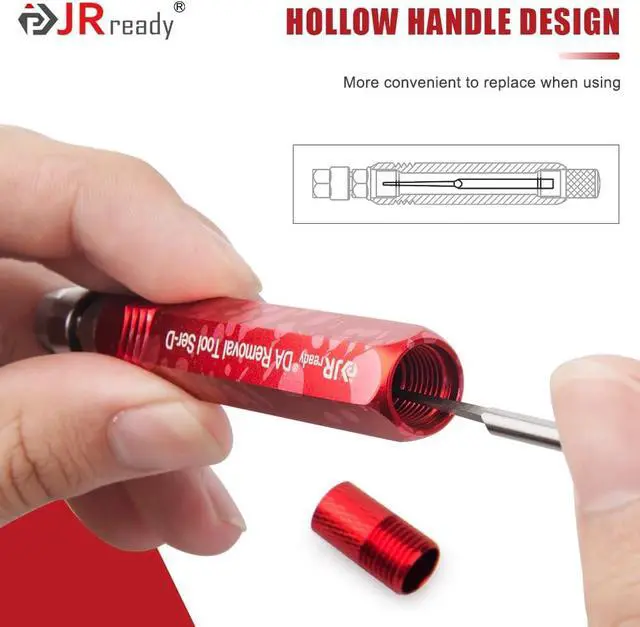 Premium Materials & Enhanced HandlingPin Removal Tool Kit boast a spring steel needle bar, aluminum alloy red camouflage handle, and hexagonal design. This combination ensures exceptional durability, strength, and a secure grip.