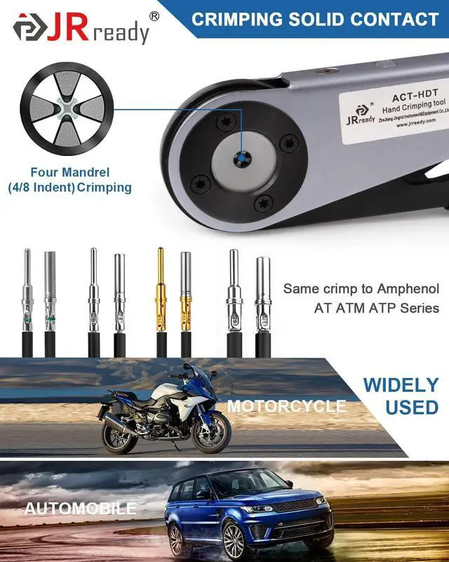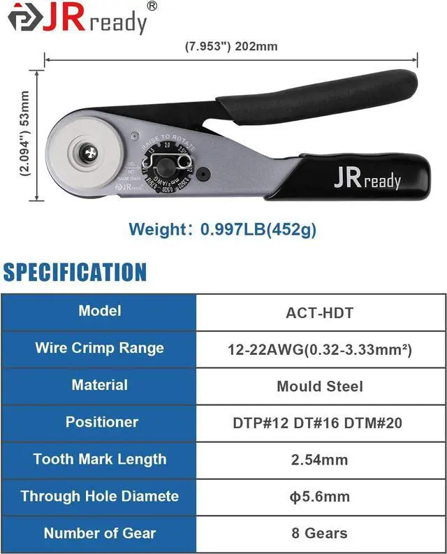 Detachable Design JRready new crimping tool is equipped with three types of positioners (# 12 # 16 # 20), corrugated spring anti-loose design, easy to install, no need to adjust the height position, reduce trial and error costs, improve work efficiency, can be carried out in mass production environment.
