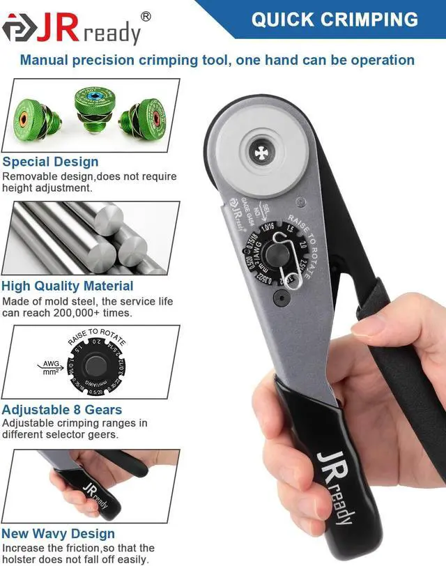Detachable Design JRready new crimping tool is equipped with three types of positioners (# 12 # 16 # 20), corrugated spring anti-loose design, easy to install, no need to adjust the height position, reduce trial and error costs, improve work efficiency, can be carried out in mass production environment.