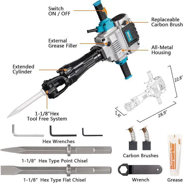 Berserker 2100W 55-Pound Demolition Jack Hammer with 1-1/8" Hex, 17-Amp Corded Electric Heavy Duty Demo Chipping Hammer Concrete/Pavement Breaker with Carrying Case Flat Chisel Bull Point Chisel