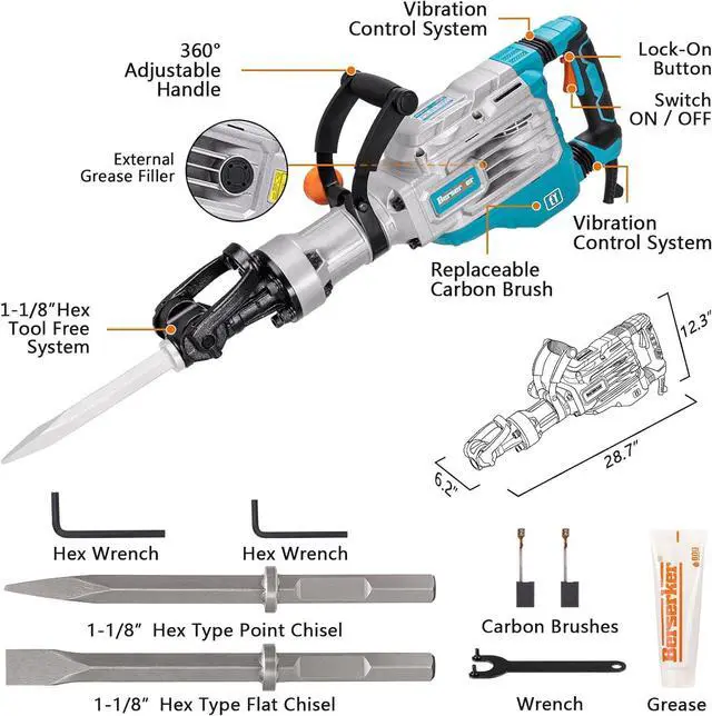 Berserker 1700W 40-Pound Demolition Jack Hammer with 1-1/8" Hex, 14.5-Amp Corded Electric Heavy Duty Demo Chipping Hammer Concrete/Pavement Breaker with Carrying Case Flat Chisel Bull Point Chisel