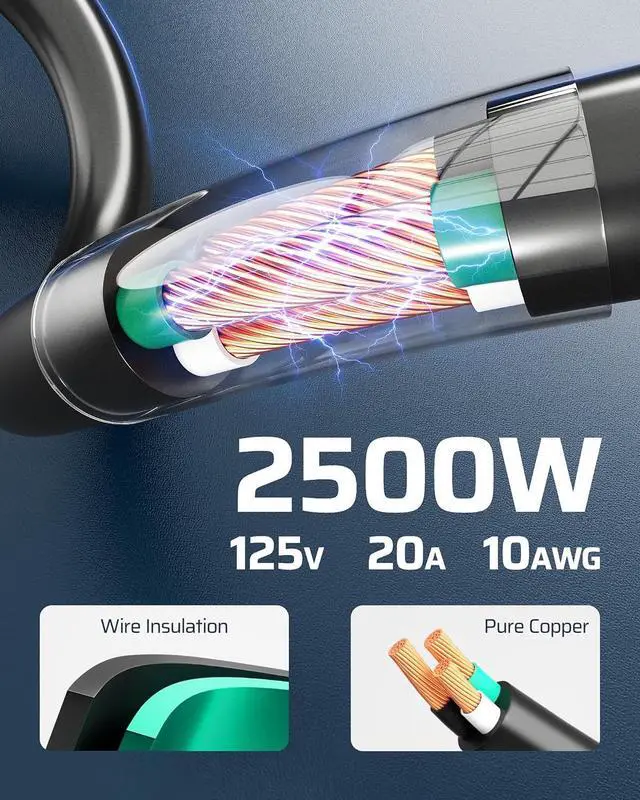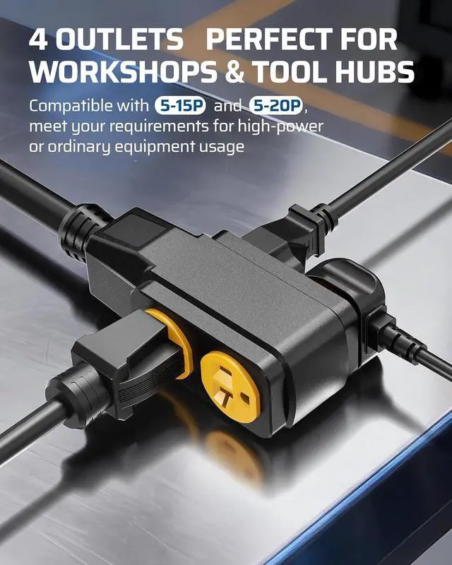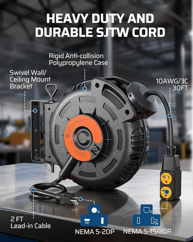 [2500W Heavy Duty Power Reel] Rated at 125V, 20A, 10AWG, up to 2500W,retractable extension cord reel supports up to four high-demand tools at once; with a NEMA 5-20R input and compatible with NEMA 5-15P and 5-20P plugs, its built for serious tools and equipment