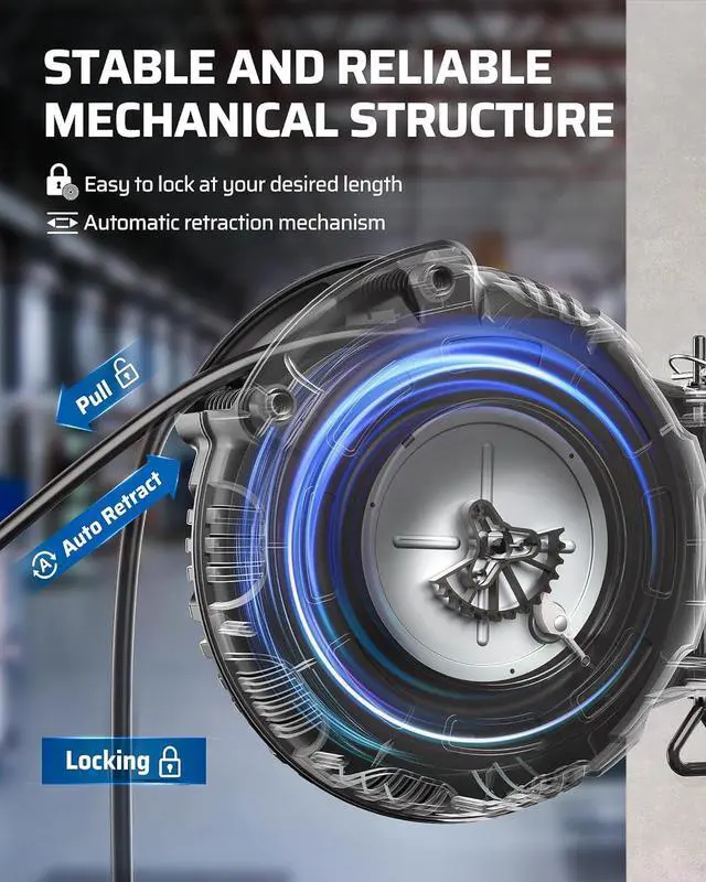 [Smooth Auto-Retract System] Features an automatic guided retraction mechanism for smooth, no-tangle power cord rewind; the oversized adjustable stopper lets you lock the 30FT extension cord reel at your preferred length, ensuring controlled retraction every time