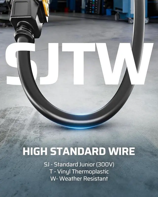 [Weather-Resistant SJTW Cord] Constructed with premium SJTW cable, this 20 amp extension cord resists UV exposure, ozone, moisture, and common garage chemicals.; the flexible, non-kinking cord remains reliable even in low temperatures for both indoor and outdoor use