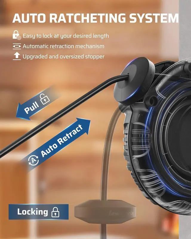 [Smooth Auto-Retract System] Features an automatic guided retraction mechanism for smooth, no-tangle power cord rewind; the oversized adjustable stopper lets you lock the 30FT extension cord reel at your preferred length, ensuring controlled retraction every time