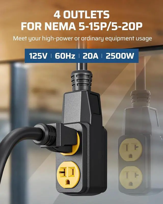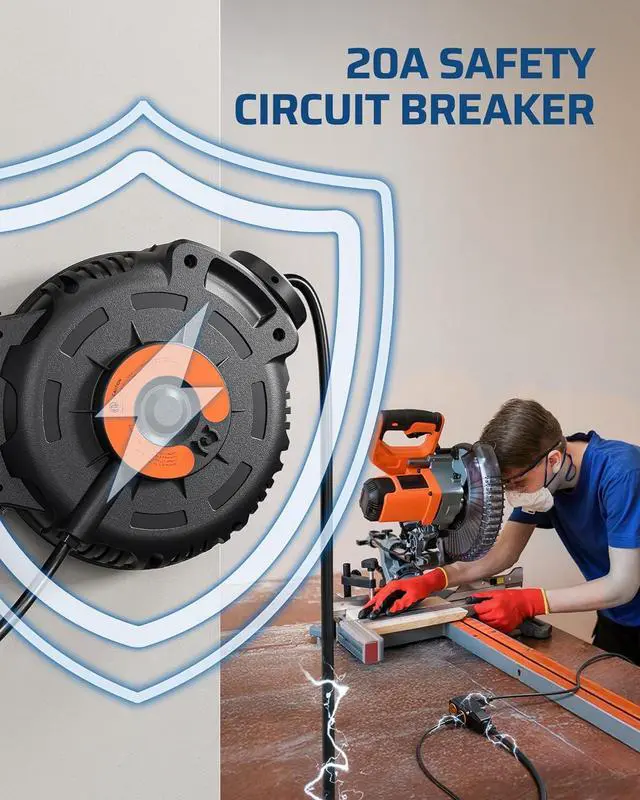 [2500W Heavy Duty Power Reel] Rated at 125V, 20A, 10AWG, up to 2500W,retractable extension cord reel supports up to four high-demand tools at once; with a NEMA 5-20R input and compatible with NEMA 5-15P and 5-20P plugs, its built for serious tools and equipment