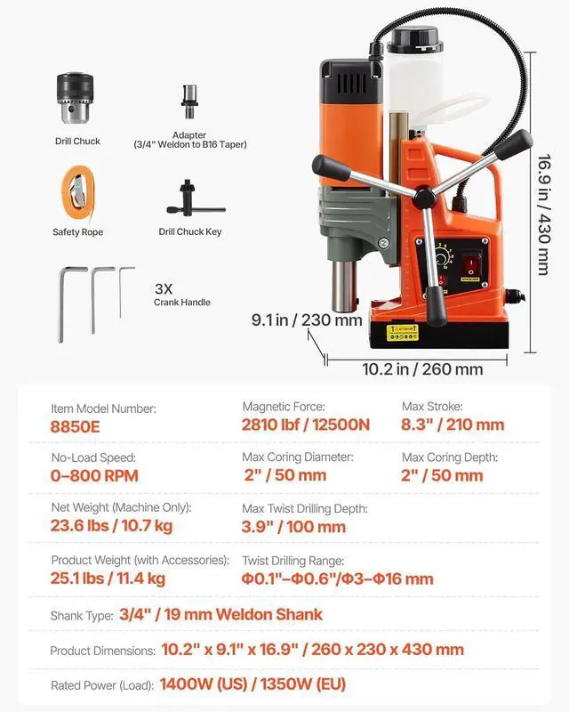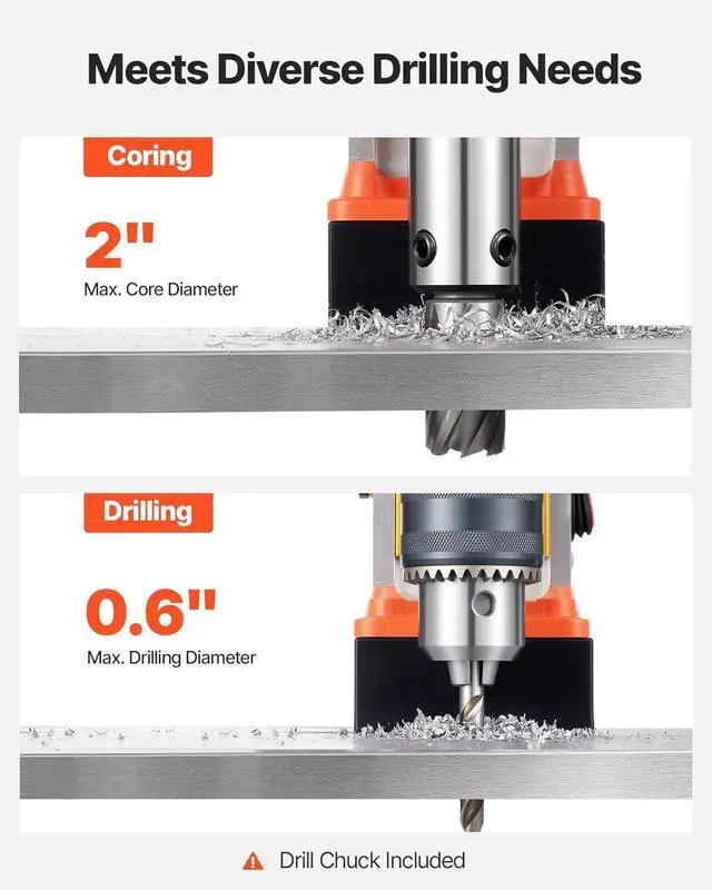 Top-level Magnet: Get ready for unstoppable power! Our electric mag drill generates exceptionally powerful driving force with its 1450W copper motor. It is capable of drilling into the toughest material at 0-800 RPM. Max. Boring Diameter (Coring Drill): 1.6 in / 40 mm; Max. Coring Depth: 2 in / 50 mm